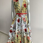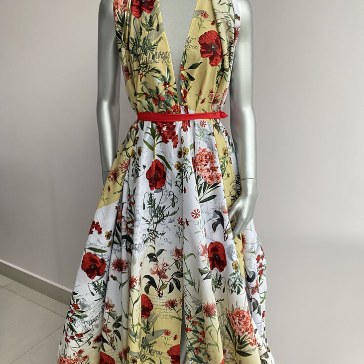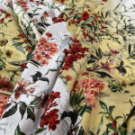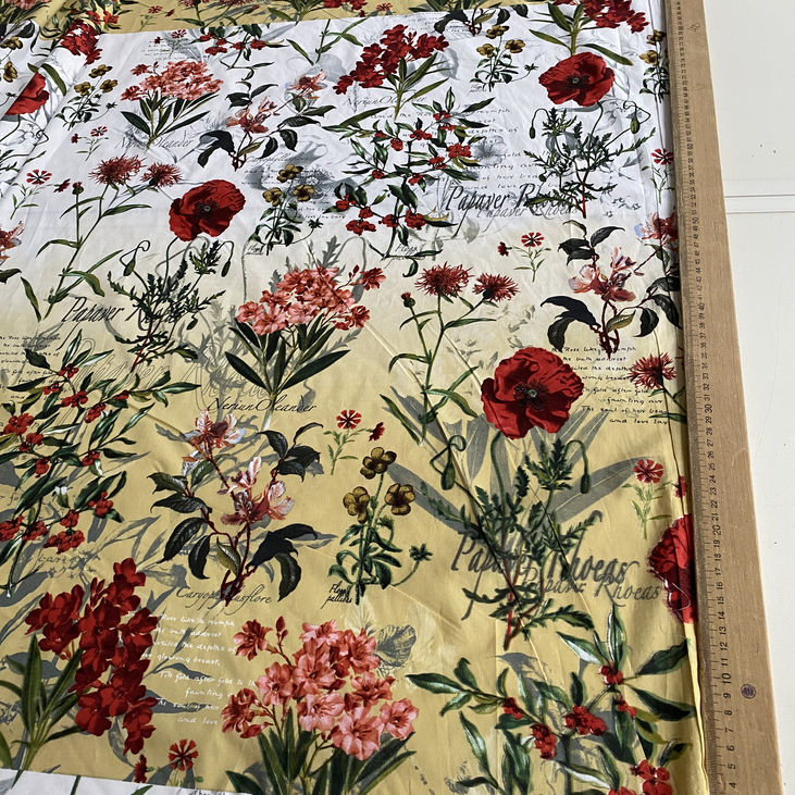 Легкий, повітряний батист з дизайнерським принтом у стилі Dolce & Gabbana — червоні маки, глибоке зелене листя, жовтий декоративний фон і стильні надписи на білому тлі створюють яскраву та впізнавану естетику.