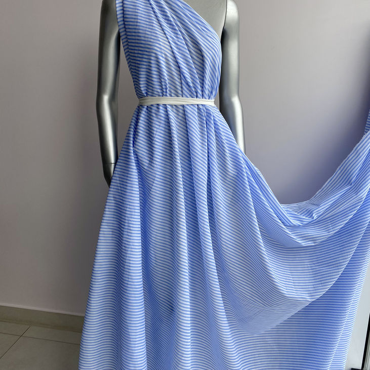 Світлі біла і блакитна смужка шириною 4 мм створює класичний і водночас свіжий малюнок, що підкреслює натуральність і ніжність батисту. Вертикальні смужки візуально подовжують силует, роблячи вироби легкими та стильними.