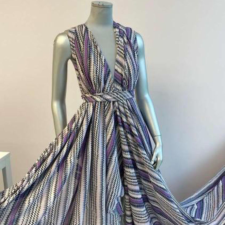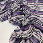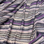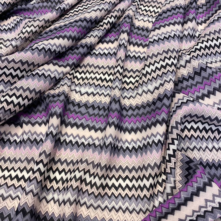 Вишукана батистова тканина в стилі Міссоні з характерним зигзагоподібним принтом у фіолетово-сірій кольоровій палітрі стане ідеальним вибором для стильного та сучасного одягу.
