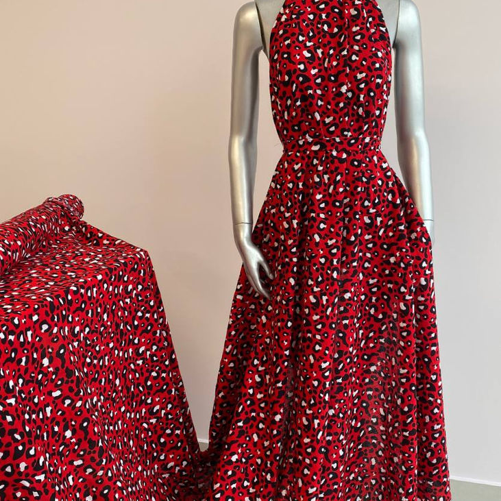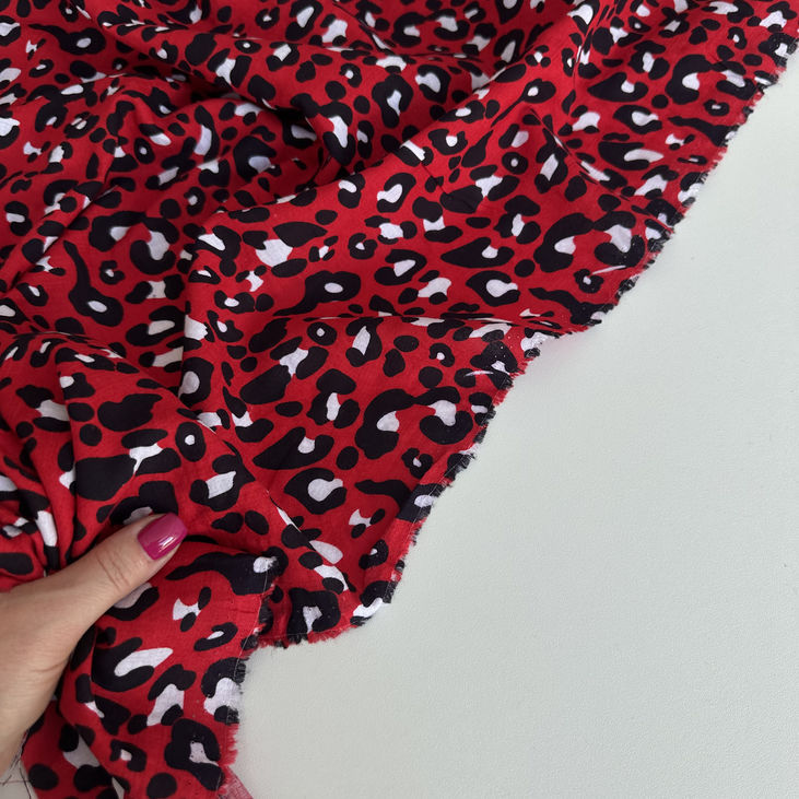 Ефектна та модна жата батистова тканина з виразним дизайном — чорно-білі абстрактні плями у стилі “лео” на яскравому червоному фоні