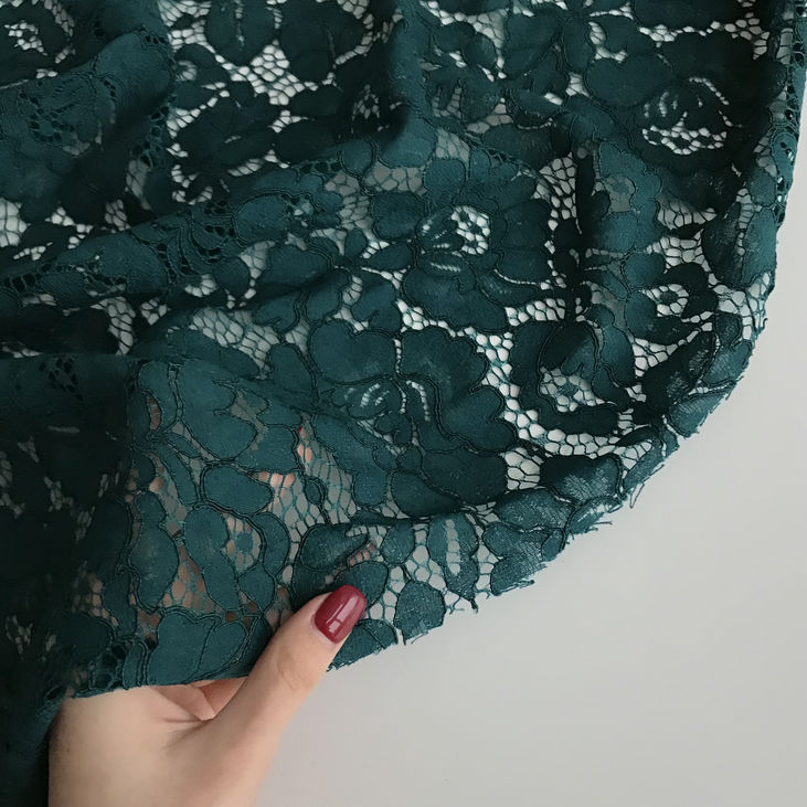 Неймовірно елегантний гіпюр насиченого бірюзово-смарагдового тону з об’ємним квітковим візерунком круглої форми, обробленим кордовою ниткою, стане ідеальним вибором для святкового, вечірнього або коктейльного вбрання.