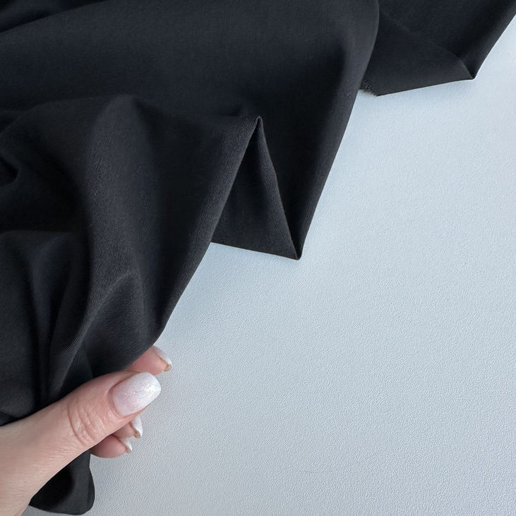 Ця тканина вирізняється особливою фактурою, яка додає глибині і виразності класичному чорному кольору. Поєднання натуральної бавовни зі стрейчевими волокнами забезпечує відмінну посадку, свободу рухів і максимальний комфорт навіть при тривалому носінні.
