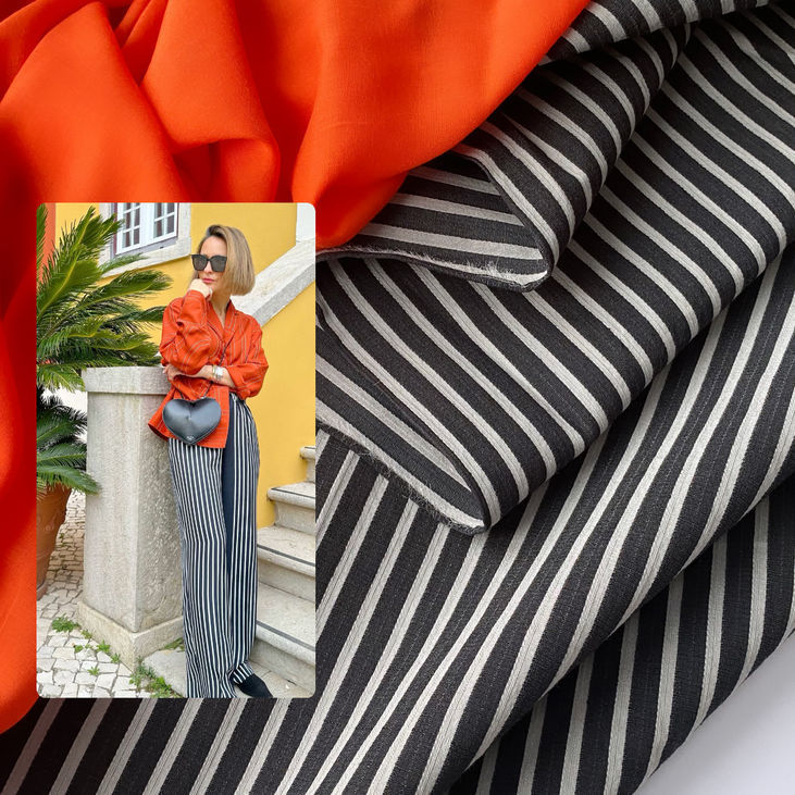 Тканина має середню щільність, що забезпечує гарне тримання форми, не просвічується і приємна на дотик. Вона дихає, легко піддається обробці і ідеально підходить для пошиття костюмів, жакетів, спідниць і брюк.