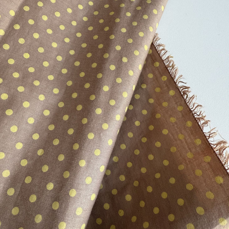 Цей котон полірований світло-бежевого відтінку з жовтими горошками діаметром 4 мм — ідеальна тканина для створення легкого, яскравого та стильного одягу.