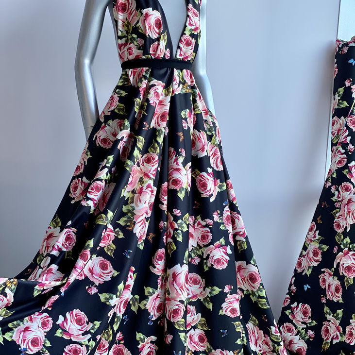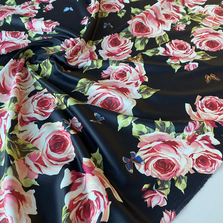 Цей котон-сатин преміум-класу з Італії вражає своїм розкішним дизайном: насичений чорний фон прикрашений реалістичними трояндами в стилі Dolce&Gabbana та витонченими метеликами.