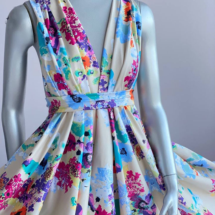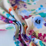 Тканина поєднує натуральність бавовни з гладкістю і ніжним блиском сатину, що надає виробам вишуканого вигляду. Різнокольорові квіти на ніжному фоні роблять тканину універсальною для літніх суконь, блуз та спідниць.