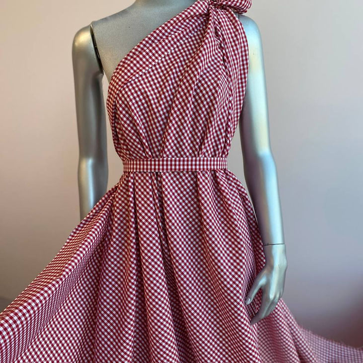 Котон з дрібною темно-червоною клітинкою (4 мм) на білому фоні — це вдале поєднання стриманої геометрії з яскравим кольоровим акцентом.