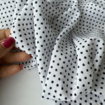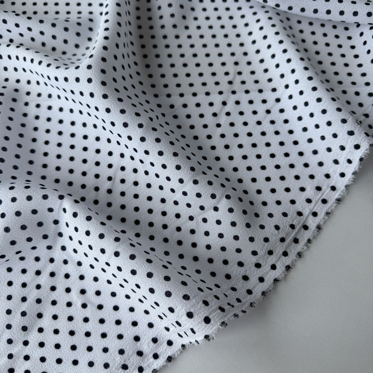 Елегантний та стриманий креп-шифон чорного кольору з дрібними чорними горошками — ідеальна тканина для створення класичного та водночас сучасного жіночого одягу.