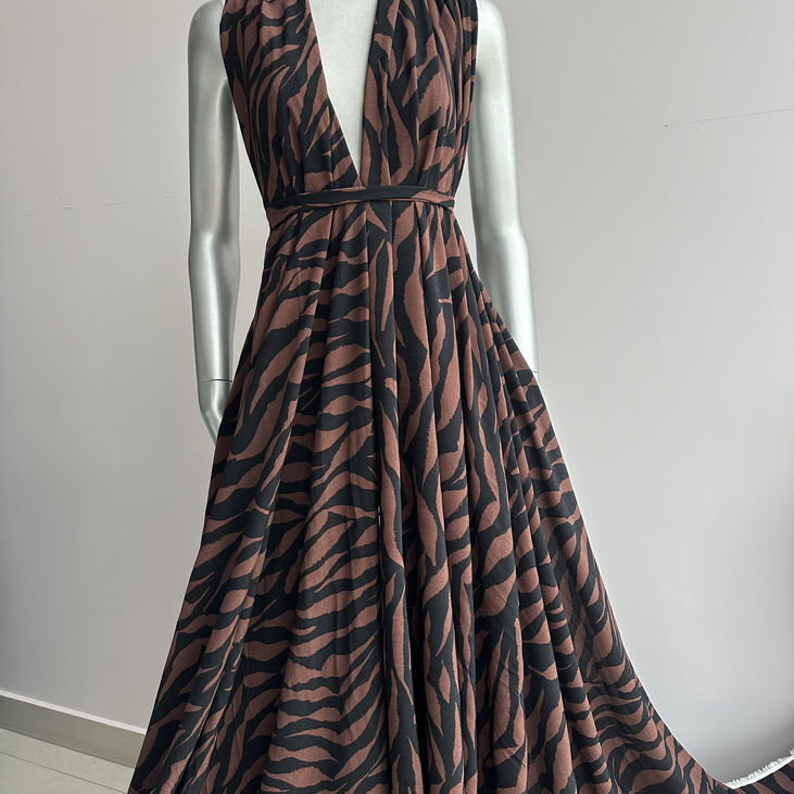Глибокий коричневий тон створює благородний фон, а зеброві лінії додають характеру. Ідеальне поєднання елегантності та свободи, яке легко перетворюється на стильні образи для міста чи відпустки.