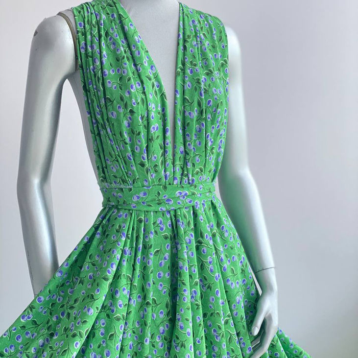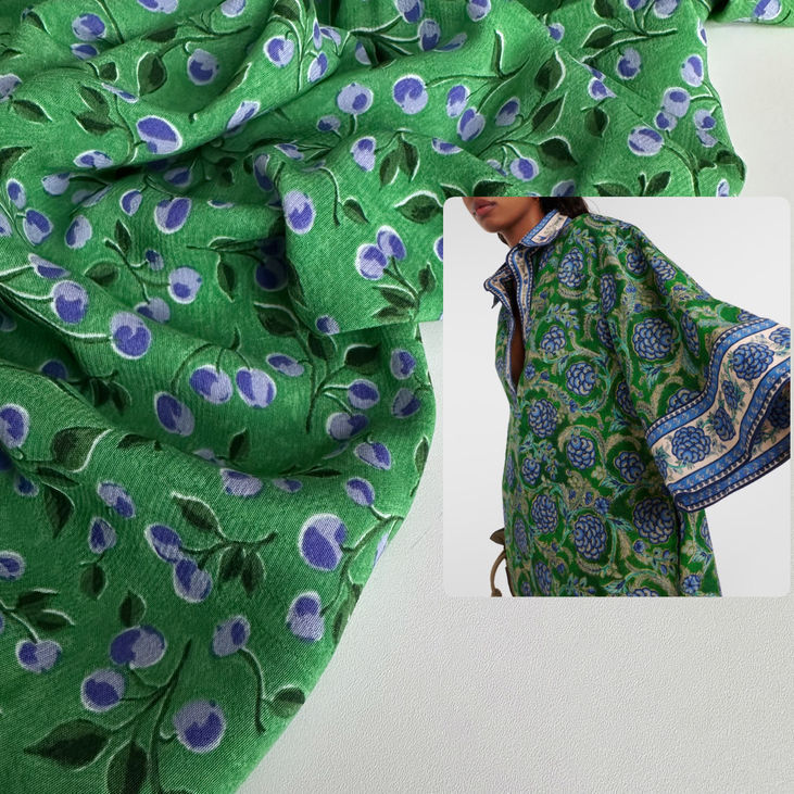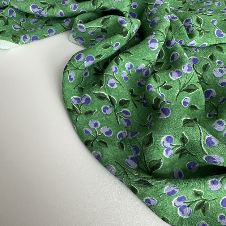 Ніжний зелений фон, що нагадує промінчики весняної трави, служить шикарним полотном для насичених фіолетових вишень, розсіяних дрібними акцентами. Такий кольоровий контраст додає тканині свіжості та фруктової грайливості, роблячи її ідеальною для яскравих літніх образів.