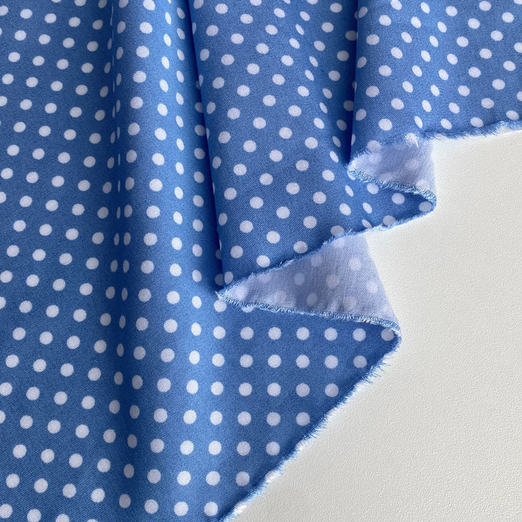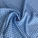 Замовляйте лайт денім із дрібними білими горошками на блакитному фоні — тканину, що поєднує в собі комфорт, стиль і ніжність.