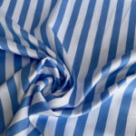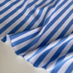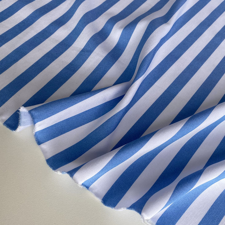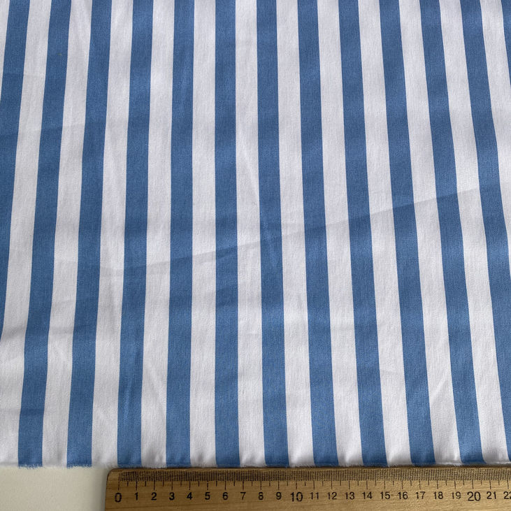Крупна вертикальна смужка шириною 1,5 см у класичному поєднанні білого і блакитного кольорів створює свіжий і динамічний малюнок, який додає виробам легкості, елегантності та візуально подовжує силует.