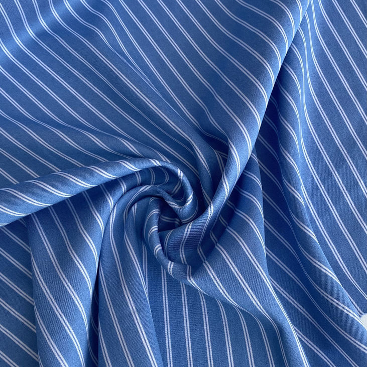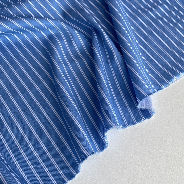 Вертикальний малюнок із блакитної смужки шириною 1 см та білої смужки шириною 2 мм створює ніжний, але виразний візерунок, який дарує виробам відчуття легкості, свіжості та візуально подовжує силует. Подвійна смужка — це сучасне дизайнерське рішення, яке додає виробам стильності та унікальності.