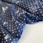 Оригінальна тканина з натурального льону темно-синього кольору, декорована білими дрібними горошками та абстрактними плямами в стилі тай-дай.