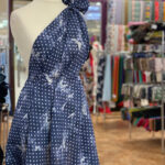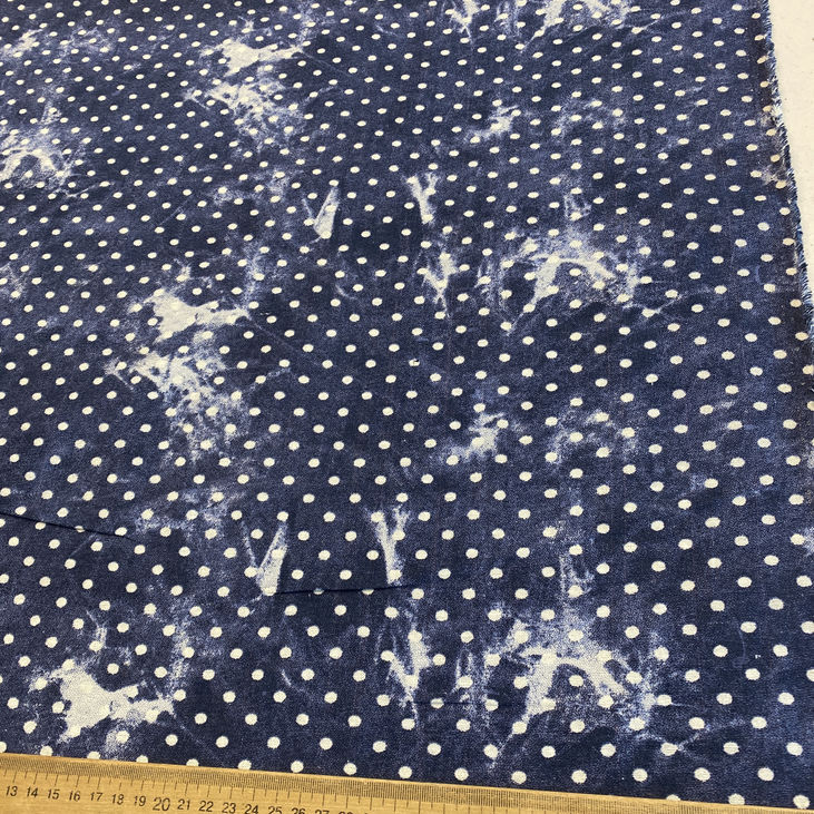 Купити темно-синій льон з білими горошками та плямами тай-дай – Ідеальна тканина для стильного та натурального образу.