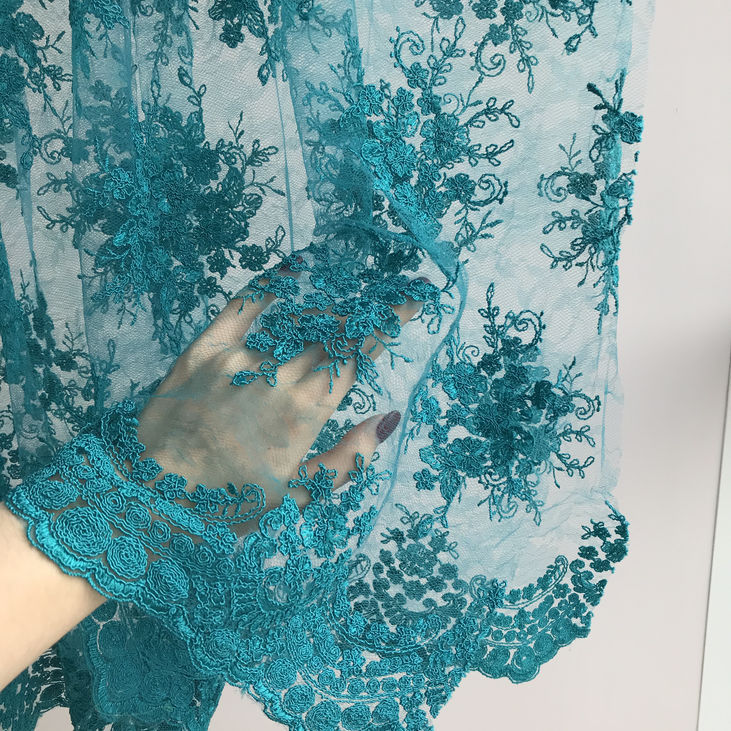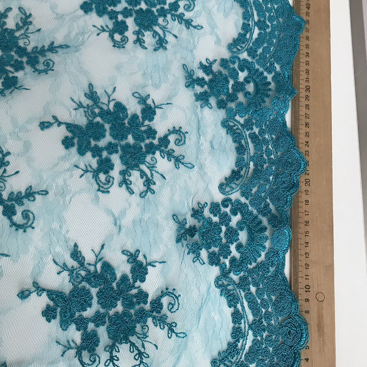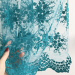 Неймовірно ніжне та водночас виразне мереживне полотно насиченого бірюзового кольору з об’ємним вишитим малюнком і фігурними фестонними краями стане чудовою основою для створення елегантного, святкового чи вечірнього вбрання.