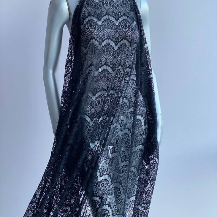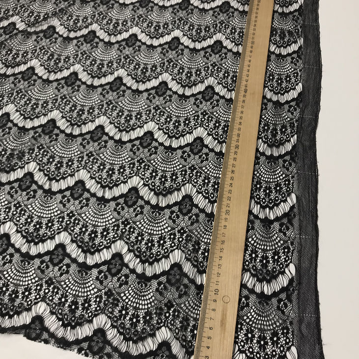 Елегантне та щільне мереживне полотно насиченого чорного кольору з декоративними «ресничками» по краях — це ідеальний матеріал для створення витонченого вечірнього, романтичного або навіть весільного образу в чорному кольорі.