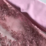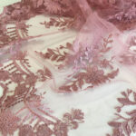 Розкішне мереживне полотно у благородному фрезовому відтінку, прикрашене фактурною вишивкою з об’ємним візерунком і завершене фігурними фестонними краями, ідеально підходить для створення елегантних та жіночних виробів.