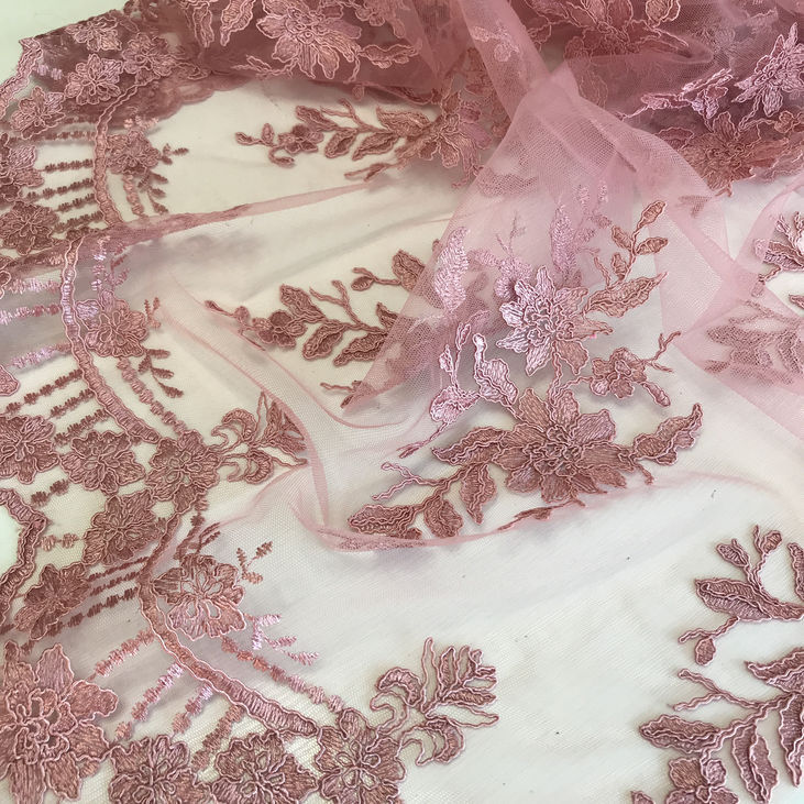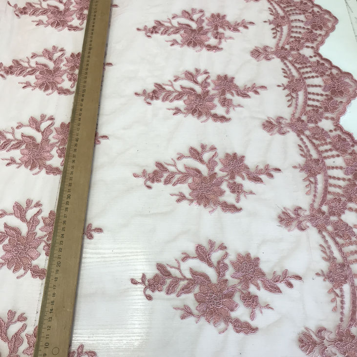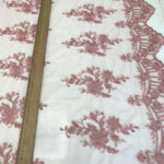 Мереживне полотно фрезового кольору з фактурним вишитим принтом та фігурними фестонними краями