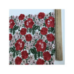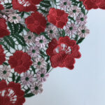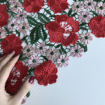 Основу складає прозора, делікатна сітка, на якій розквітають об’ємні квіти з ефектом 3D — червоні, мов стиглі троянди, і ніжно-рожеві, немов пелюстки світанкового півонії. Зелене листя додає природного балансу, створюючи глибину та живу текстуру, яка виглядає справжнім мистецтвом на тканині.
