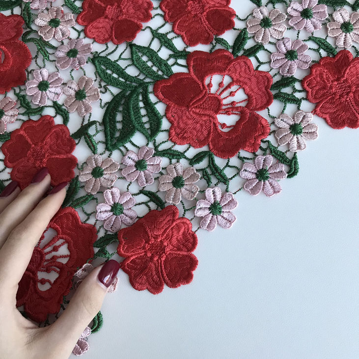Мереживне полотно з об’ємними квітами червоного й ніжно-рожевого кольору та зеленим листям