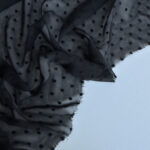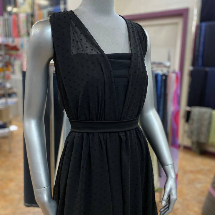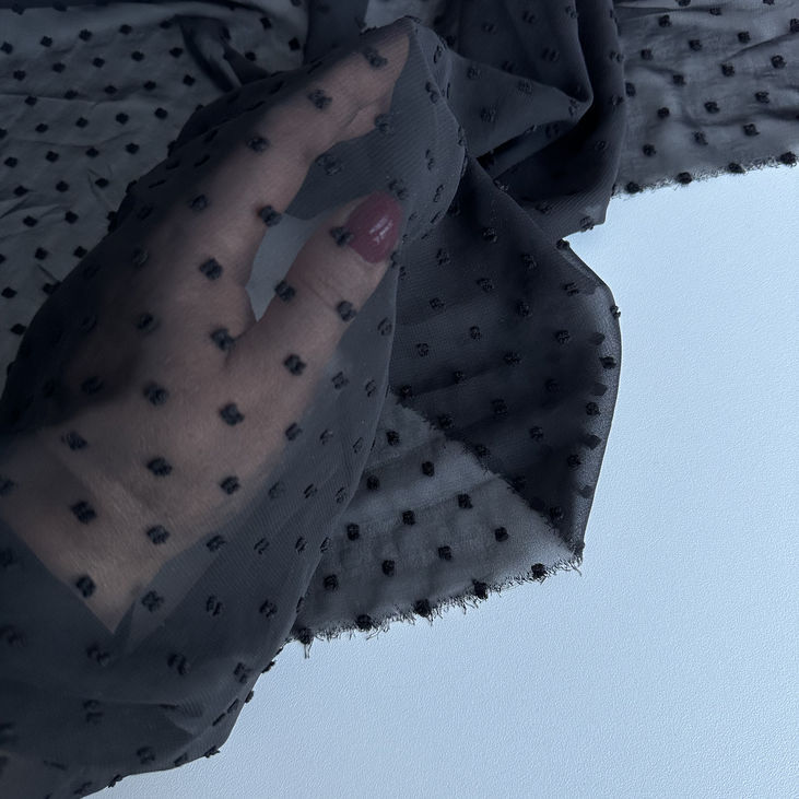 Властивості тканини: легка, дихаюча, невагома, має благородну напівпрозорість, притаманну шифону, пупирки додають текстурності, акценту, об’єму, м’яко драпірується, лягає у складки, створює “живий” силует.