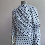 Стильна крепова тканина для суконь білого кольору з класичним принтом горошку діаметром 1 см у синьо-чорній гамі. Щільніша за шифон, ця тканина м’яко тримає форму, не просвічується та має легку зернисту текстуру, властиву крепу.