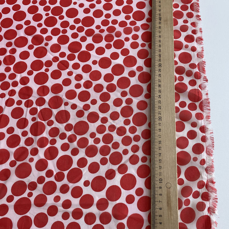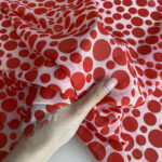 Особливість цього дизайну — в контрастному принті з чорних горохів двох розмірів: великих (3,2×3,2 см) та дрібніших (1,1×1,1 см). Така комбінація створює цікавий ритм і глибину візерунку, роблячи тканину більш живою та динамічною.