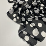 Основний чорний фон — глибокий і насичений, а великі білі горошки розміром 4,5×4,5 см створюють яскравий графічний акцент. Такий принт миттєво притягує погляд і робить навіть найлаконічніший виріб виразним.