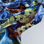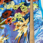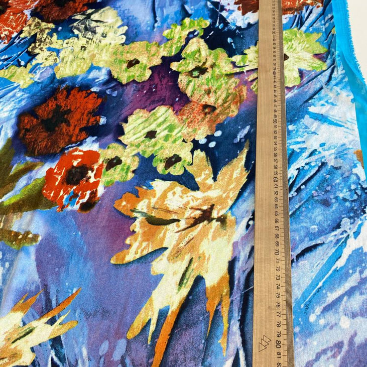 Дизайн тканини нагадує картину, написану аквареллю: на глибокому синьо-блакитному фоні плавно розкриваються великі квіти в коричневих і карамельних відтінках