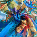 Купити шовкову тканину бірюзового кольору з метеликами та квітами можна з доставкою по Україні.