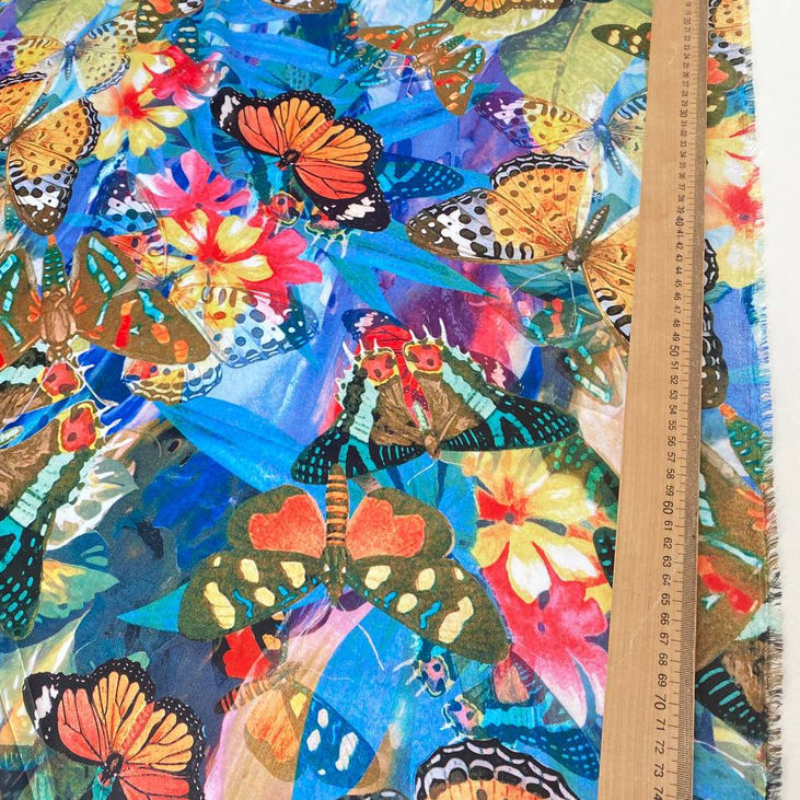 Яскрава та елегантна шовкова тканина бірюзового кольору з крупним абстрактним принтом метеликів і квітів — чудовий вибір для створення виразного, повітряного та жіночного одягу.