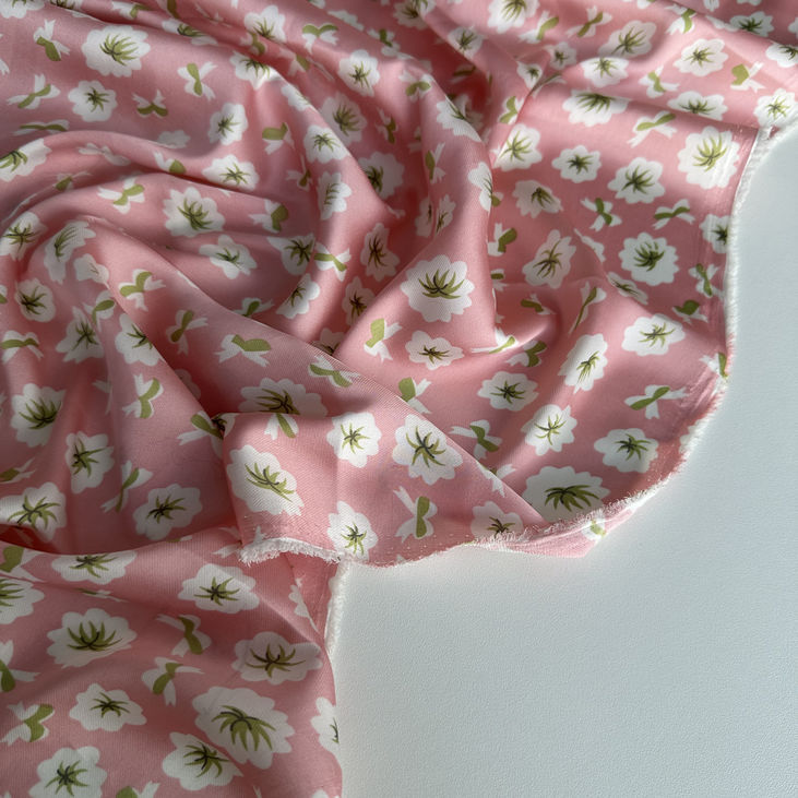 Ніжна шовкова тканина блідно-рожевого відтінку з витонченим принтом білих квітів з яскравими зеленими серединками.