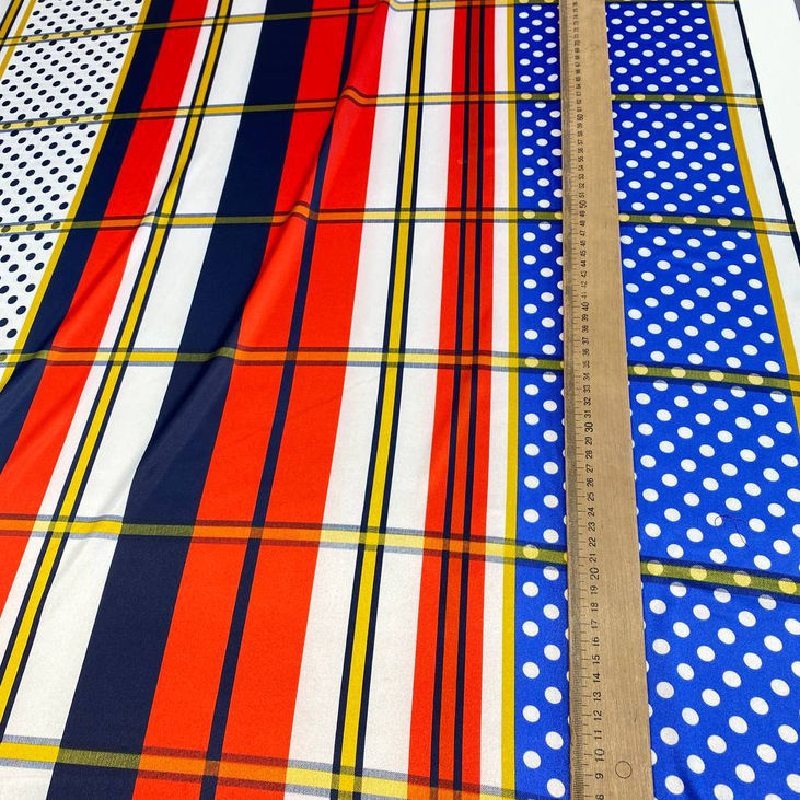 Шовкова тканина з графічною абстракцією — смужки та горошки в синьо-червоно-чорній гамі