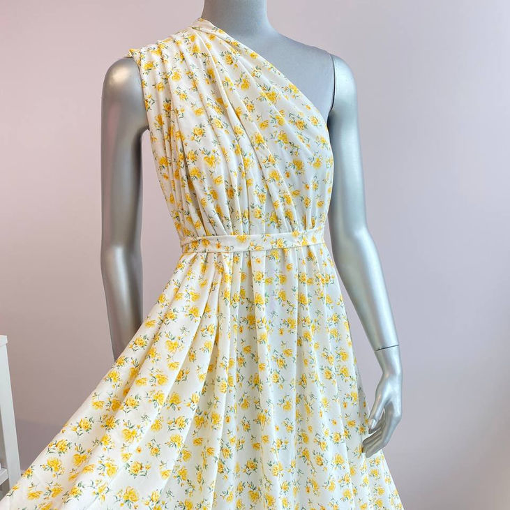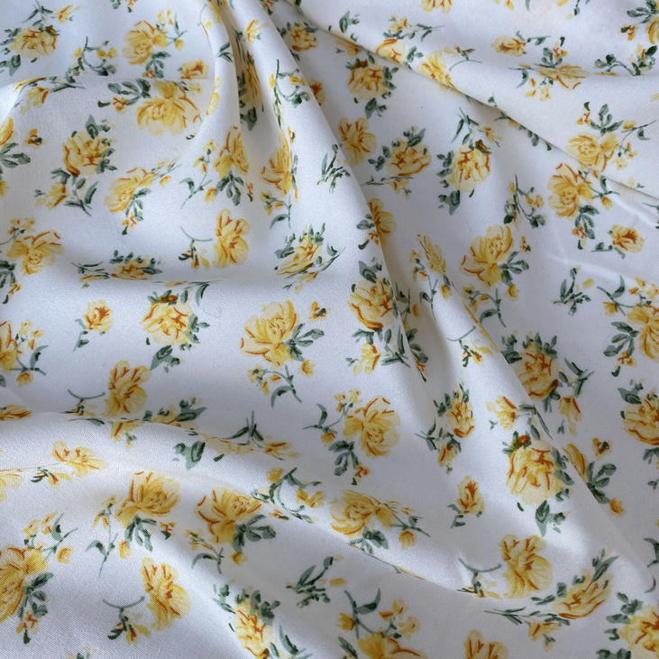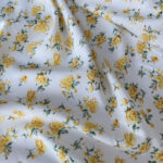 Переваги: Натуральна основа — «дихає» і комфортна у спекотну погоду. Насичений, але не перенасичений принт. Гарна посадка по фігурі. Легко комбінується з однотонними тканинами. Принт: жовті квіти та зелене листя на білому фоні