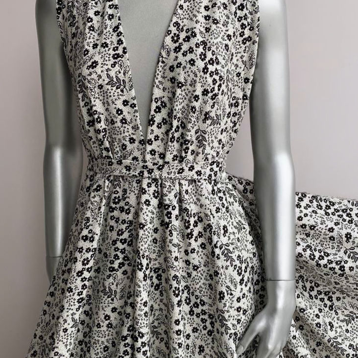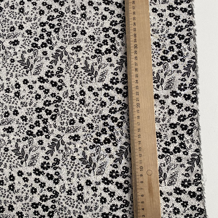 Легка, повітряна та приємна до тіла тканина з витонченим дизайном: чорний дрібний квітковий принт та акуратні крапочки на білому фоні створюють естетику мінімалізму з нотками романтики. Ідеальний варіант для літнього або весняного одягу у стилі natural, casual чи boho.