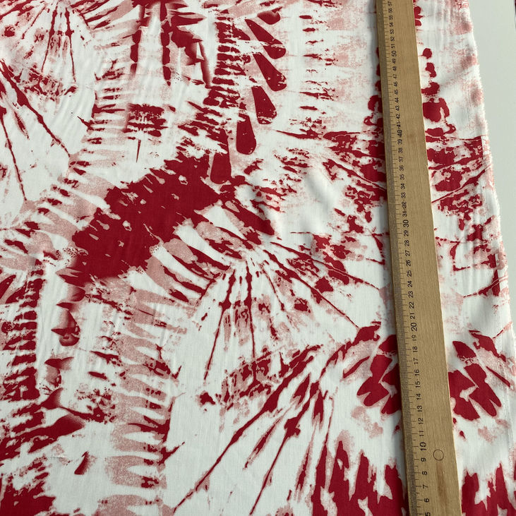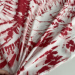 — стильна тканина для яскравого літнього одягу. Легка, м’яка і повітряна тканина штапель віскоза з яскравим абстрактним принтом “Віяло” у бордових та рожевих тонах на білому фоні.