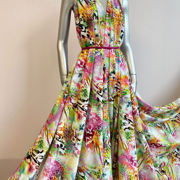 Переваги тканини: Дизайнерський принт — квіти + лео в сучасному виконанні. Приємна до тіла, не прозора, добре драпірується. Невагома, повітряна структура — ідеальна для спеки. Ексклюзивна італійська якість