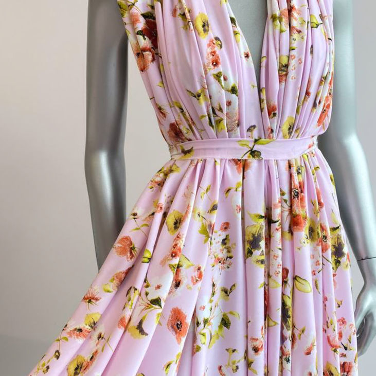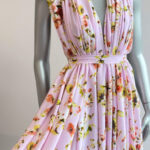 Ніжний рожевий фон, ніби припудрений персиком, прикрашений вишуканими квітами та розсипом зеленуватого листя — ідеальне рішення для створення легких, романтичних образів.