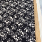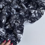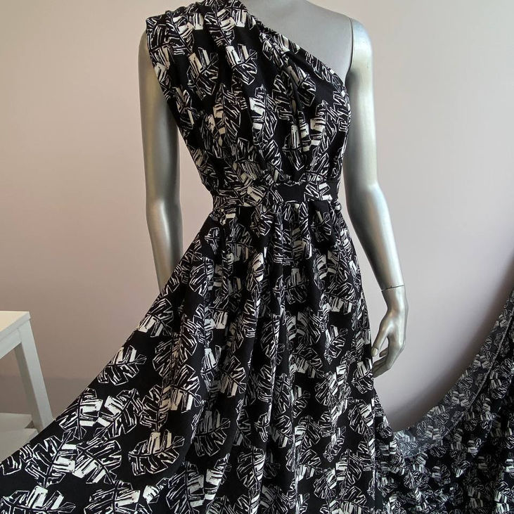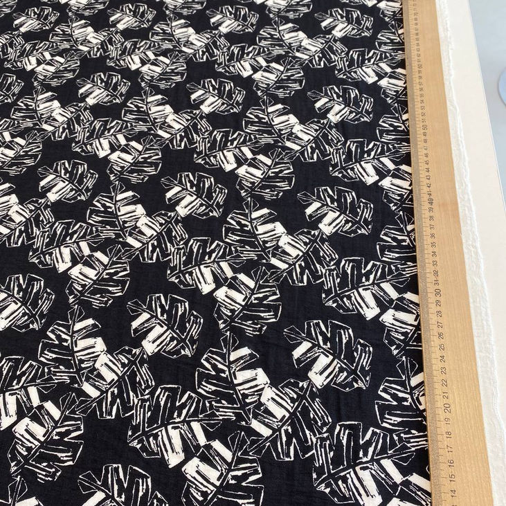 Цей штапель нейлон — витончений приклад сучасного текстильного дизайну, де поєднується комфорт і естетика. Глибокий чорний фон виступає ідеальним полотном для контрастного білого принта у вигляді стилізованих пальмових листків, що створює візуальний ритм і додає тканині тропічного характеру. Такий малюнок виглядає стильно, сучасно й універсально — як для міського гардеробу, так і для курортних образів.