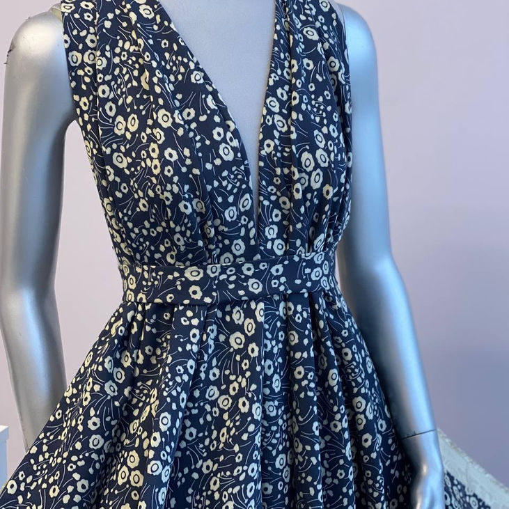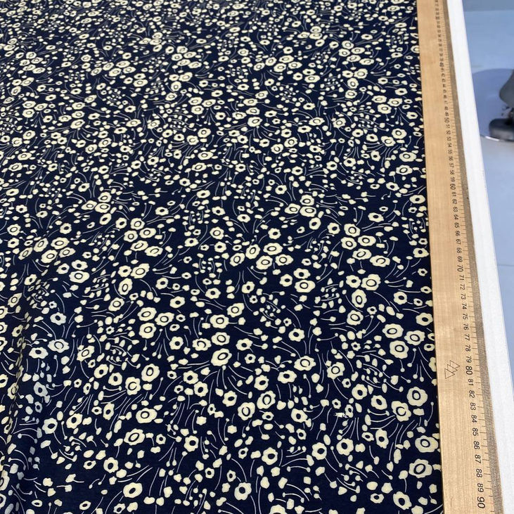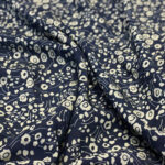 Цей штапель-нейлон поєднує в собі приємну класичну глибину синього кольору з ніжністю дрібного абстрактного флористичного малюнка у відтінках бежевого та лимонного.