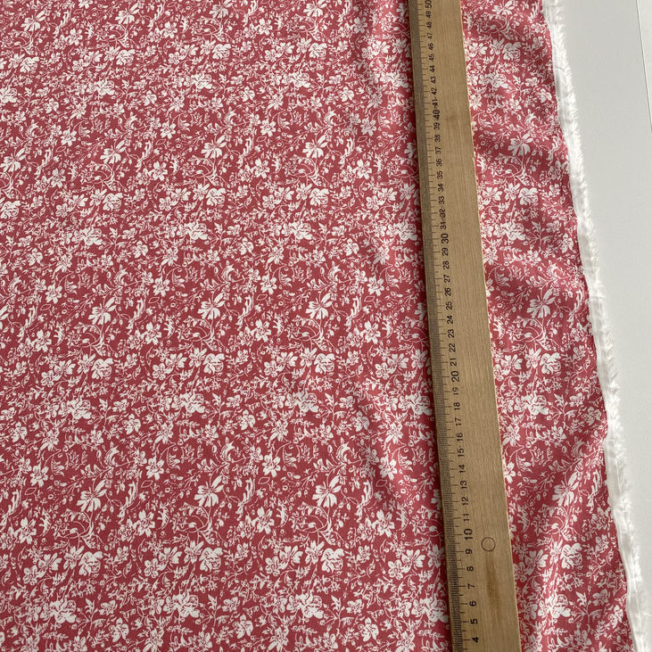Легка та ніжна тканина з квітковим принтом у мереживному стилі. Фрезовий (рожево-бежевий) фон додає м’якості, а білі квіти — витонченості. Ідеальна для створення літнього одягу.
