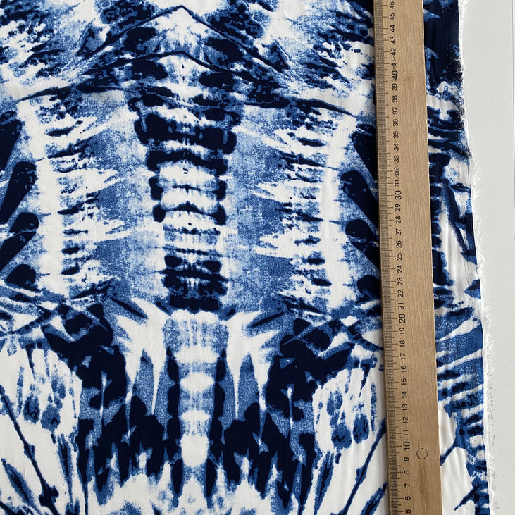 Легка та приємна до тіла тканина штапель віскоза з абстрактним принтом “Віяло” в синіх відтінках на білому фоні.