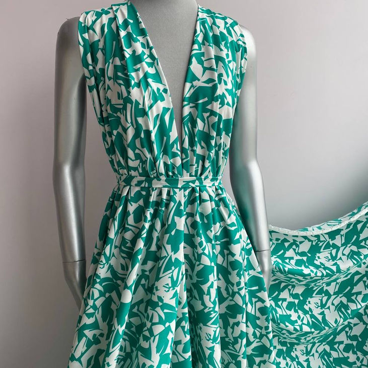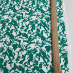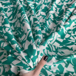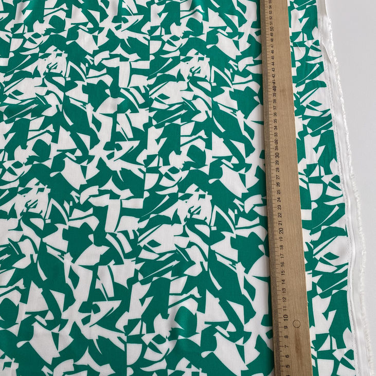 Цей штапель — поєднання свіжості кольору та лаконічного принта. На фоні насиченого зелено-бірюзового відтінку контрастно виглядає біла графіка — геометрична й стильна. Ідеальна тканина для створення оригінального одягу на весну та літо: вона виглядає сучасно, легко драпірується та дуже приємна до тіла.