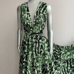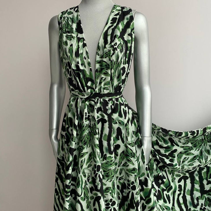 Смілива й виразна тканина з принтом у стилі енімал-дизайн. Абстрактна зеброва смуга у відтінках зеленого та чорного робить цю віскозу ідеальною для створення трендового літнього одягу.