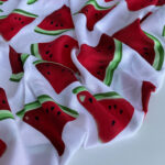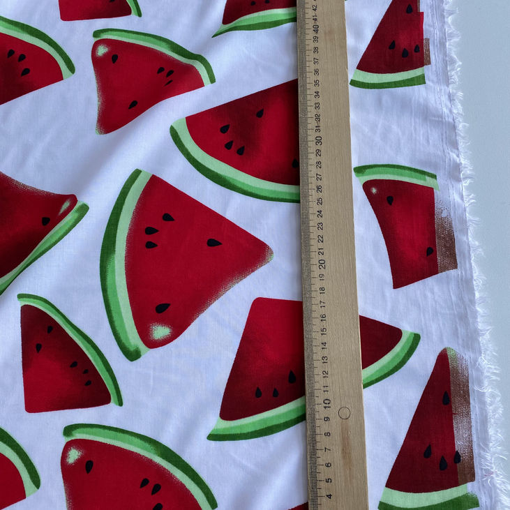 Штапель віскоза з принтом у вигляді стиглих червоних скибок кавуна на білосніжному фоні