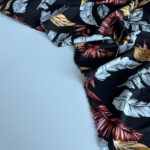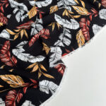— елегантна та легка тканина з виразним флористичним принтом, який поєднує теплі теракотові та ніжні білі відтінки на глибокому чорному тлі. Ідеальний вибір для створення стильних і комфортних виробів, які підкреслять вашу індивідуальність.