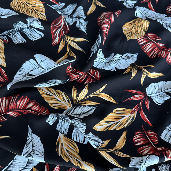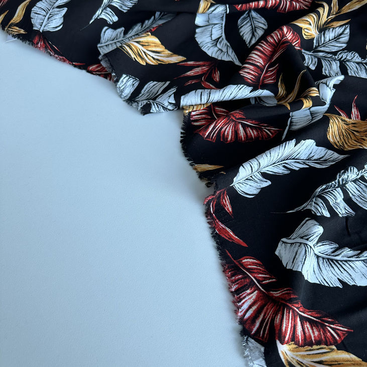 Матеріал чудово драпірується, повітропроникний і приємний на дотик, що робить його відмінним варіантом для суконь, блуз, спідниць та тунік на будь-який сезон. Виразний принт із теракотово-білими листями.
