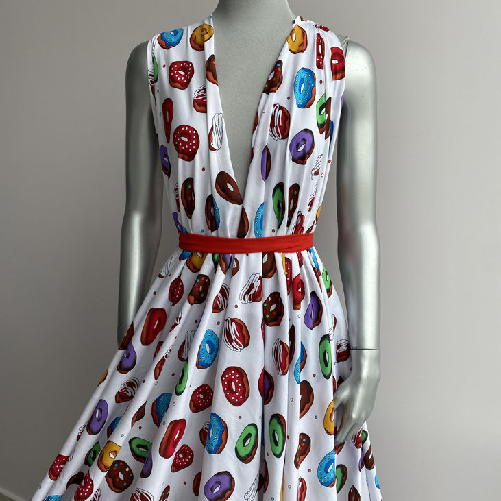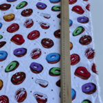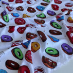 Штапель віскозний з принтом у вигляді яскравих, апетитних пончиків на білому тлі