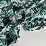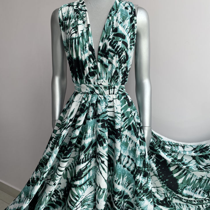 Легка та повітряна тканина штапель віскоза з яскравим абстрактним принтом “Віяло” у зелених і чорних відтінках на білому фоні. Ідеальний вибір для створення унікальних літніх образів — суконь, блуз, сарафанів або легких спідниць.
